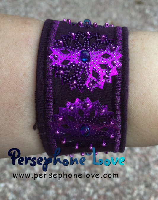 Purple embroidered/beaded silver sequin upcycled denim bracelet-1169