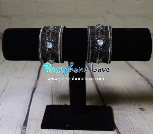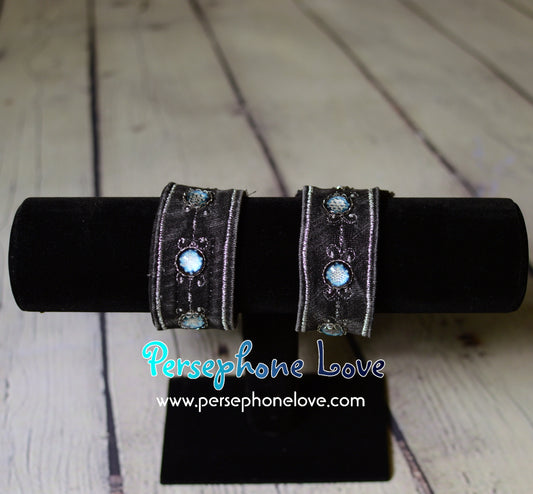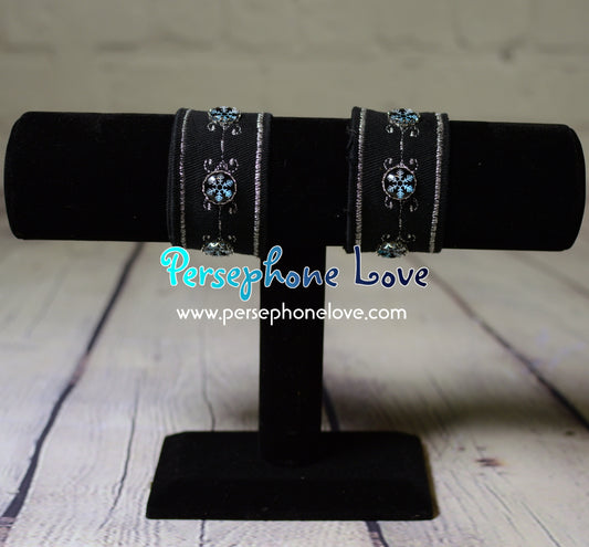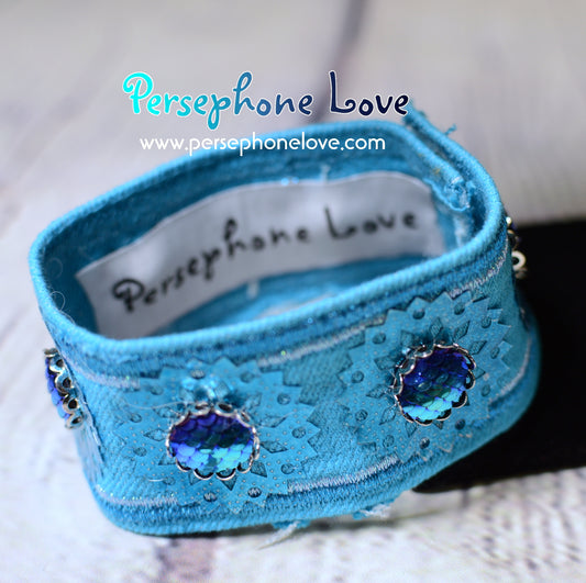 Ooooo sparkles! Bracelets made from reclaimed denim. Some are sold as a set with matching necklace/earrings. There are a few that are just earrings, or earrings paired with a necklace. It's hard to photograph two bracelets, plus necklace, plus earrings all in one photo so when you see something that interests you, do see all the photos for that item so you can see what's included. 🙂