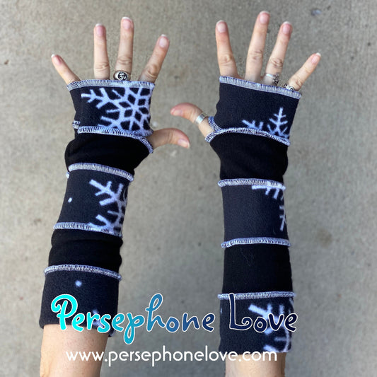 Katwise inspired needle-felted black white snowflake 100% cashmere/fleece upcycled sweater arm warmers -1427