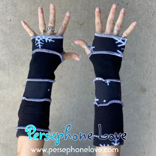 Katwise inspired needle-felted black white snowflake 100% cashmere/fleece upcycled sweater arm warmers -1426