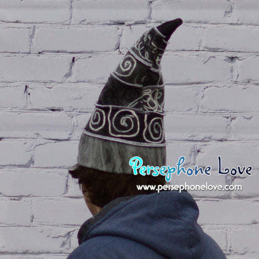 Katwise-inspired grey swirl felted cashmere/wool recycled patchwork sweater elf hat-1348