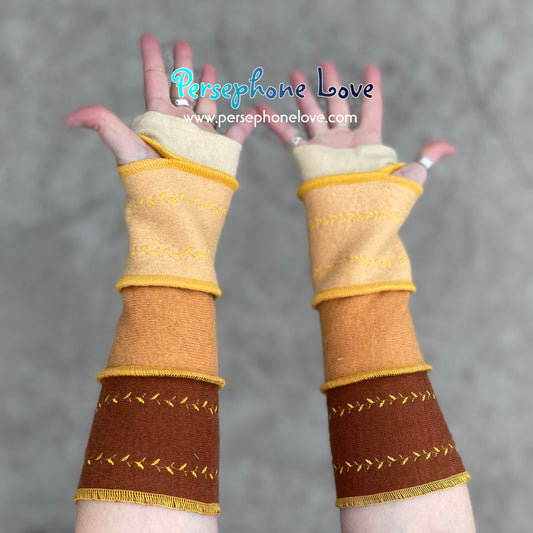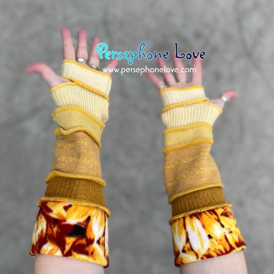 Katwise inspired needle-felted golden sunflower embroidered upcycled sweater arm warmers-1369