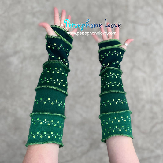 Katwise inspired needle-felted green 100% CASHMERE upcycled sweater arm warmers SEQUINS-1370