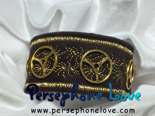 Brown gold metallic embroidered steampunk upcycled denim bracelet-1136