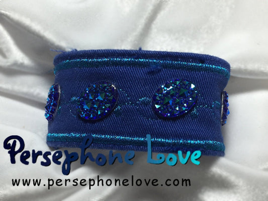 Blue turquoise embroidered upcycled denim bracelet-1135