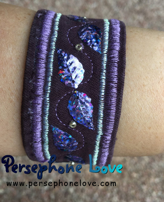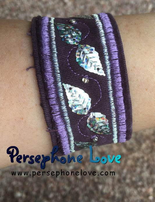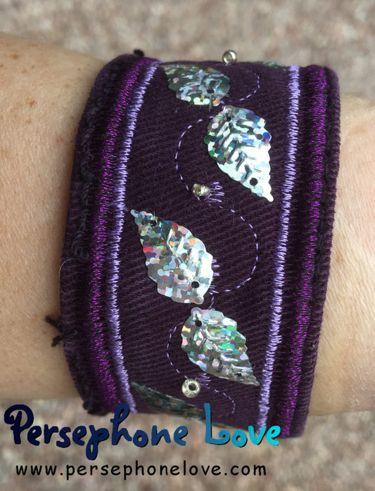 Purple embroidered/beaded silver sequin upcycled denim bracelet-1169