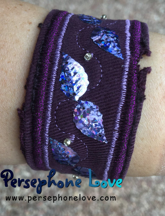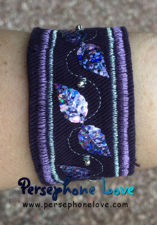 Purple embroidered/beaded purple sequin upcycled denim bracelet-1172