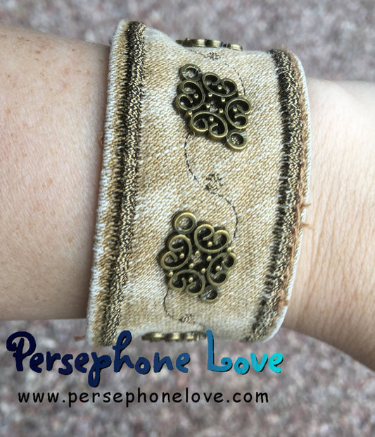 Tan bronze embroidered upcycled denim steampunk bracelet-1178
