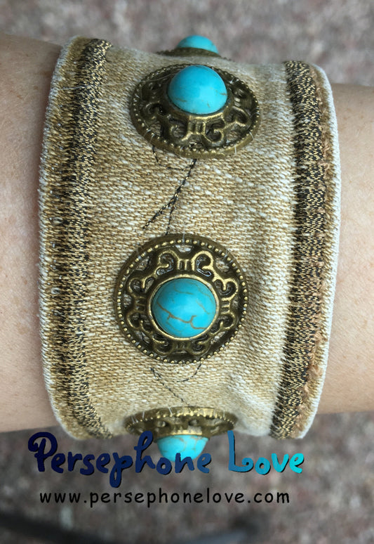 Tan bronze embroidered upcycled denim turquoise steampunk bracelet cuff festival jewelry-1183