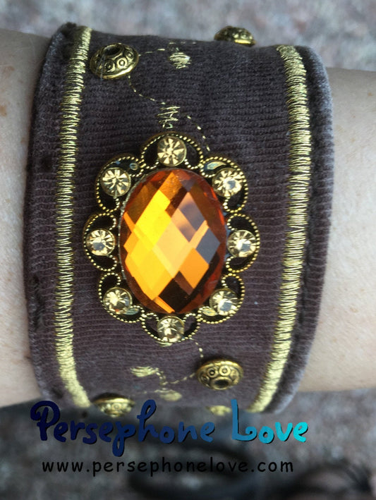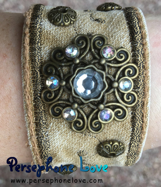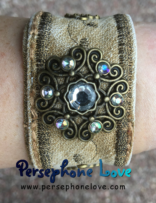 Tan bronze embroidered upcycled denim steampunk rhinestone bracelet-1181