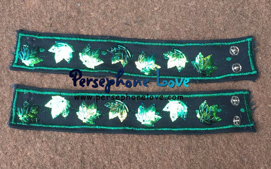 TWO green embroidered maple leaf sequins upcycled hippie festival denim bracelets