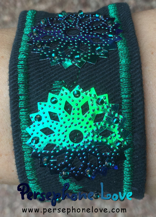Green beaded kaleidoscope sequin upcycled denim hippie festival bracelet-1190