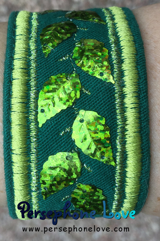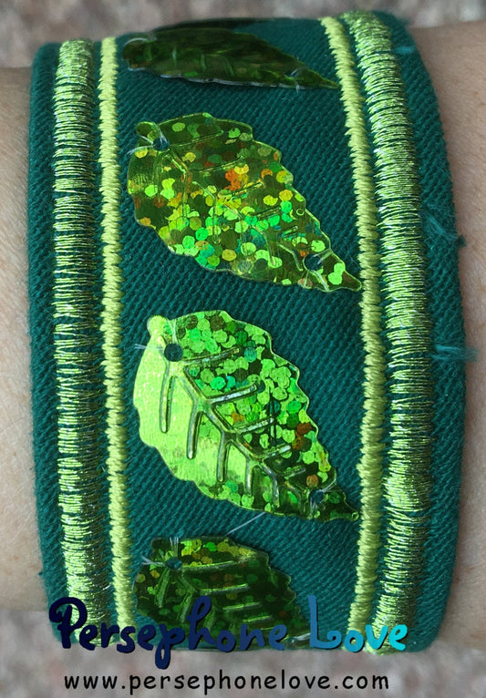 Green embroidered leaf sequin upcycled denim festival bracelet-1191