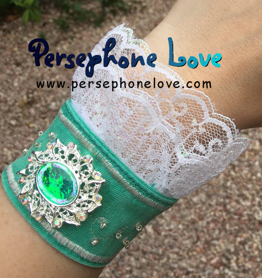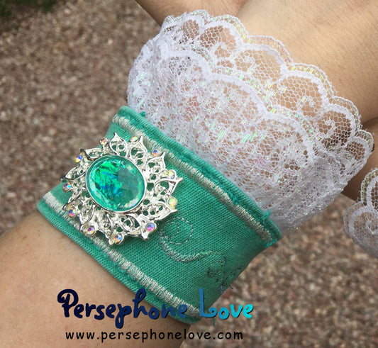TWO green silver embroidered upcycled Victorian Rococo French chic look denim lace bracelets