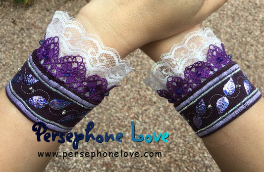 TWO Purple silver embroidered upcycled Victorian Rococo denim beaded lace bracelets