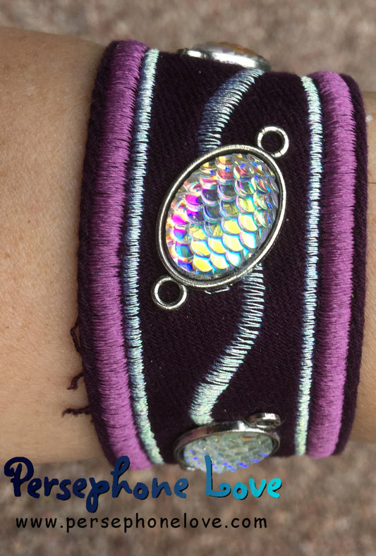 Purple embroidered mermaid scale beaded upcycled embroidered denim bracelet-1176