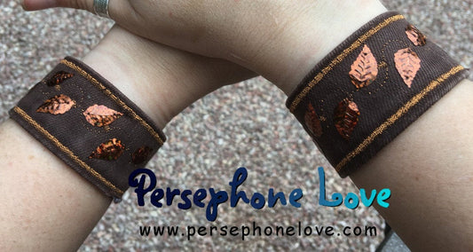 TWO bronze embroidered fall colors leaf sequins upcycled denim bracelets-1182
