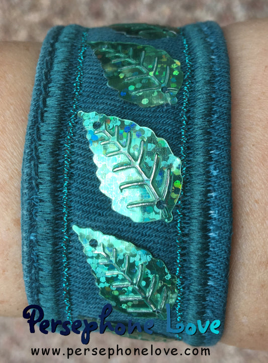Teal turquoise embroidered leaf sequin upcycled denim hippie festival bracelet-1187