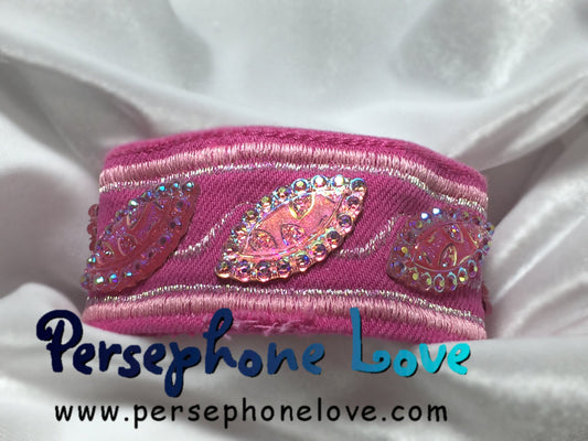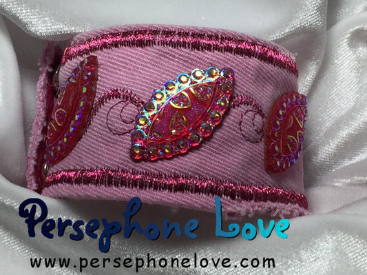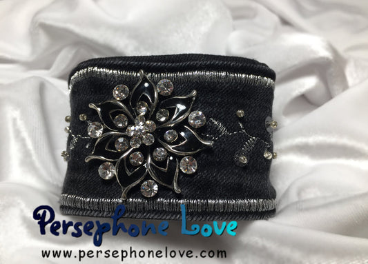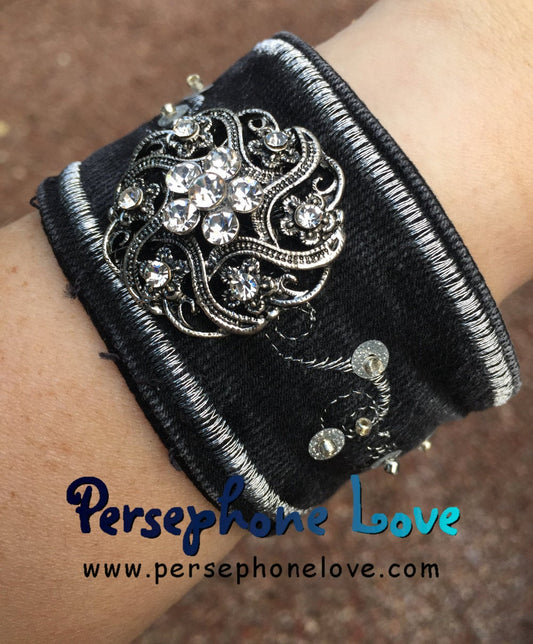 Black silver embroidered upcycled Gothic denim rhinestone bracelet-1113
