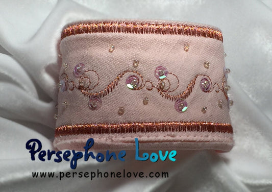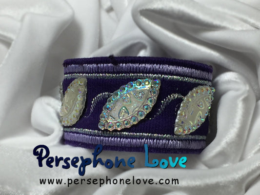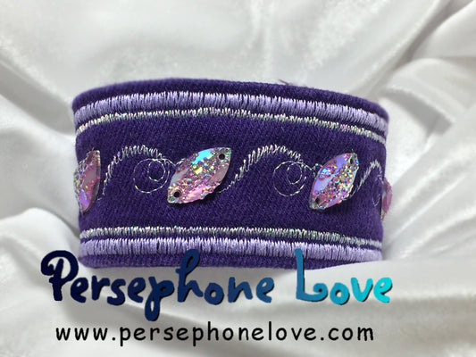 Purple, lavender and iridescent white/silver embroidered upcycled denim bracelet-1122