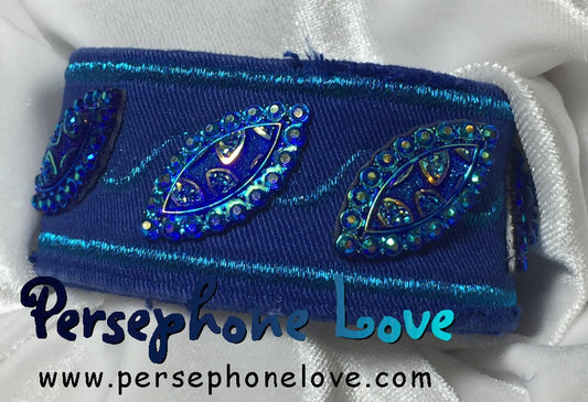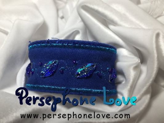 Blue turquoise embroidered upcycled denim bracelet-1102