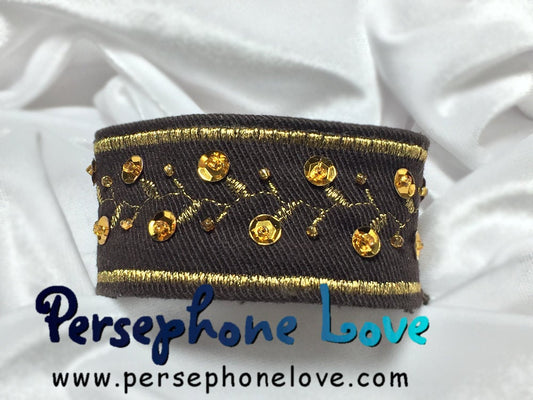 Brown antique gold metallic embroidered steampunk gear upcycled denim bracelet-1114