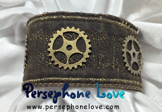 Brown gold metallic embroidered steampunk gear upcycled denim bracelet-1116