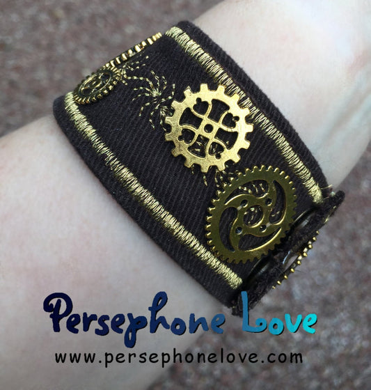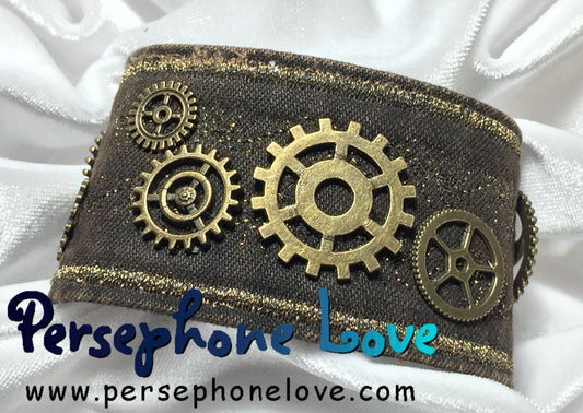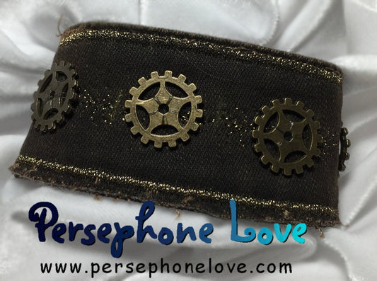 Brown antique gold metallic embroidered steampunk gear upcycled denim bracelet-1145