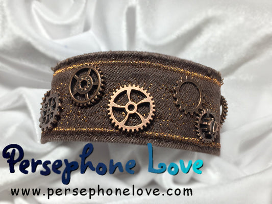 Brown copper metallic embroidered steampunk gear upcycled denim bracelet-1166