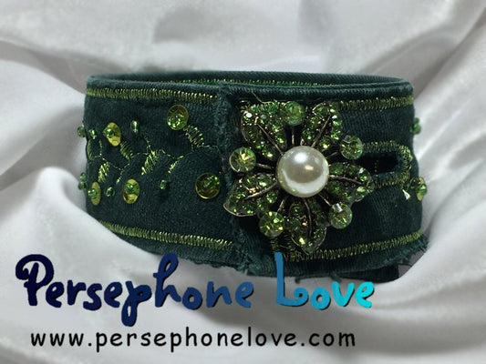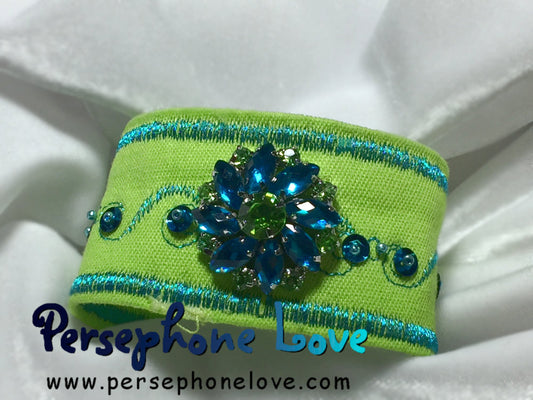 Lime green teal embroidered upcycled denim bracelet rhinestone - SMALL-1125