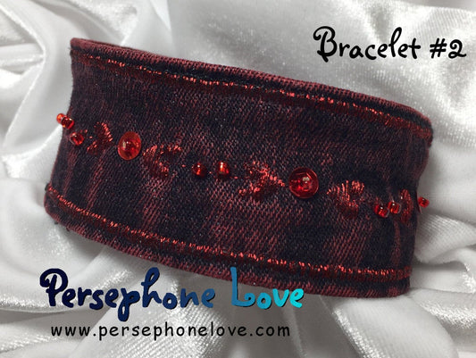 TWO Red Black embroidered beaded upcycled denim bracelets