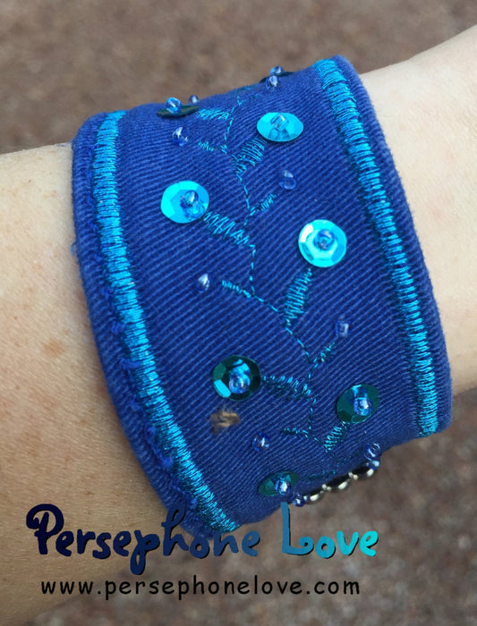Blue embroidered beaded upcycled denim lace bracelet-1143