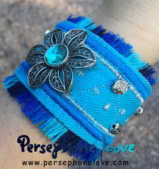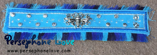 Blue silver embroidered beaded upcycled denim bracelet honeybee charm fringe-1163