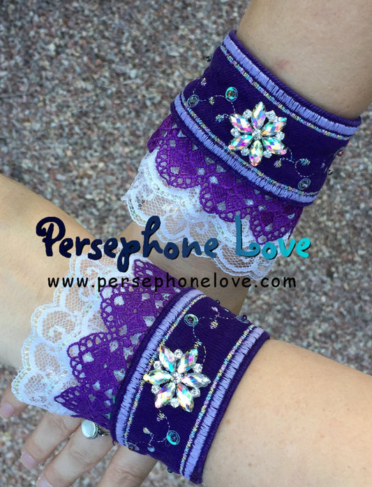 TWO Purple lavender iridescent white embroidered upcycled rhinestone denim bracelets