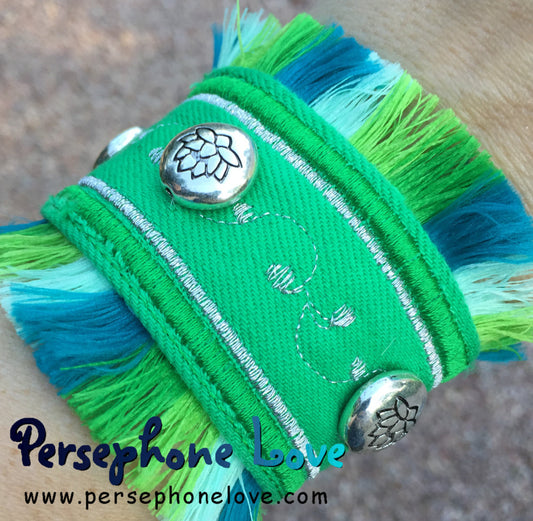 Green /silver metallic embroidered beaded upcycled boho denim bracelet lotus charms-1109