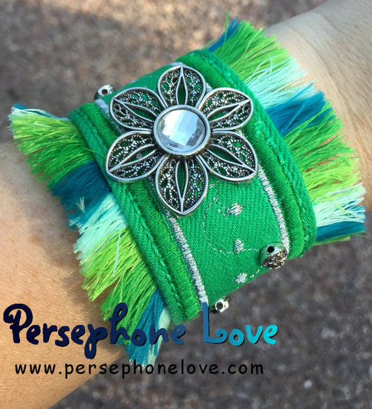 Green silver embroidered beaded upcycled denim bracelet filigree flower charm fringe-1140