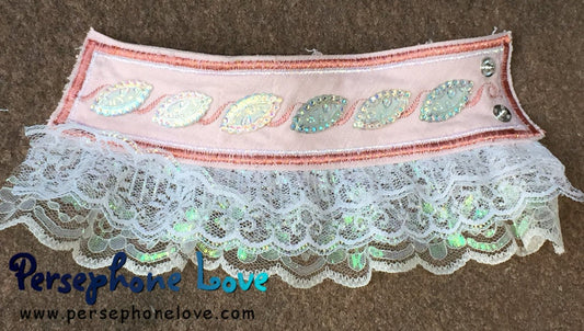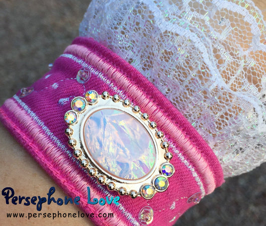 Pink metallic embroidered beaded upcycled denim lace bracelet rococo jewelry-1202