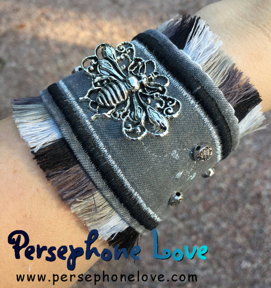 Grey silver embroidered beaded upcycled denim bracelet honeybee charm jewelry fringe-1128