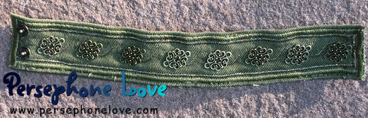 Olive green antique gold embroidered Celtic knot upcycled denim bracelet-1154