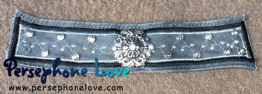 Grey silver metallic embroidered beaded upcycled denim bracelet rhinestone flower charm jewelry-1112