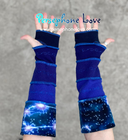 Katwise inspired needle-felted galaxy embroidered blue upcycled sweater arm warmers-1358