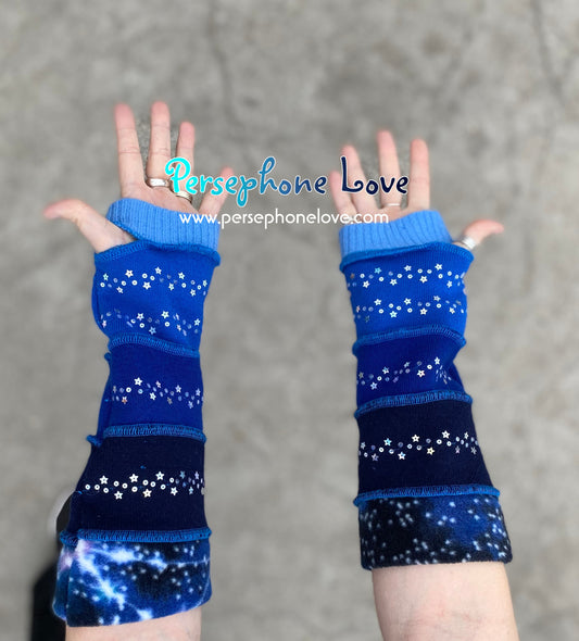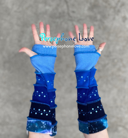 Katwise inspired needle-felted gradient galaxy blue upcycled sweater arm warmers SEQUINS-1357
