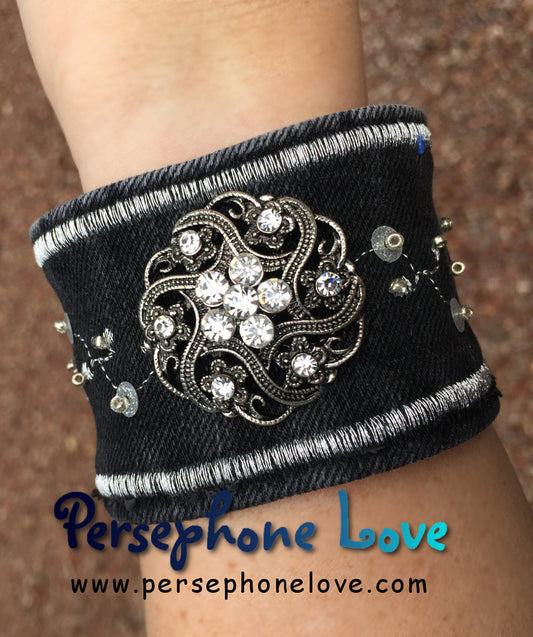 Black silver embroidered upcycled Gothic denim rhinestone bracelet-1108
