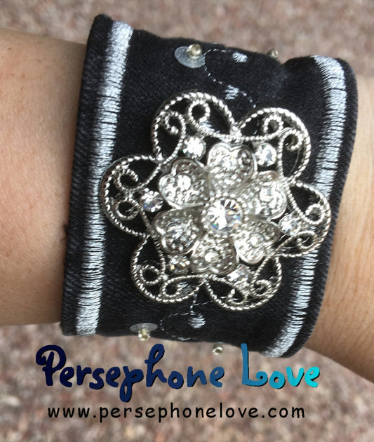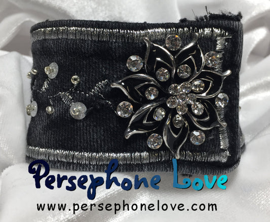 Black silver embroidered upcycled Gothic denim rhinestone bracelet-1113