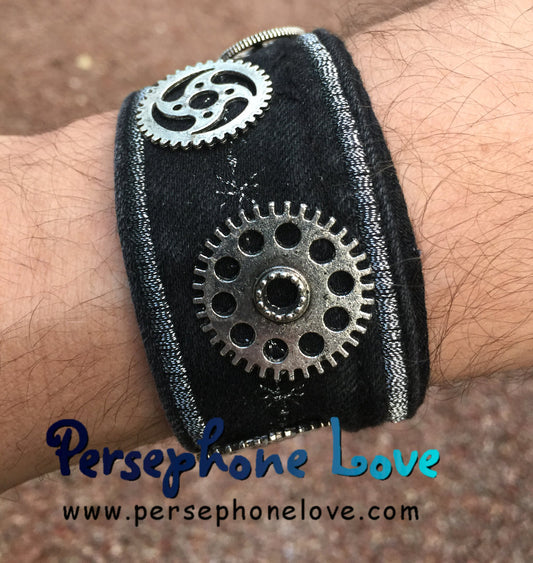 Black silver gear steampunk biker industrial upcycled denim bracelet-1203