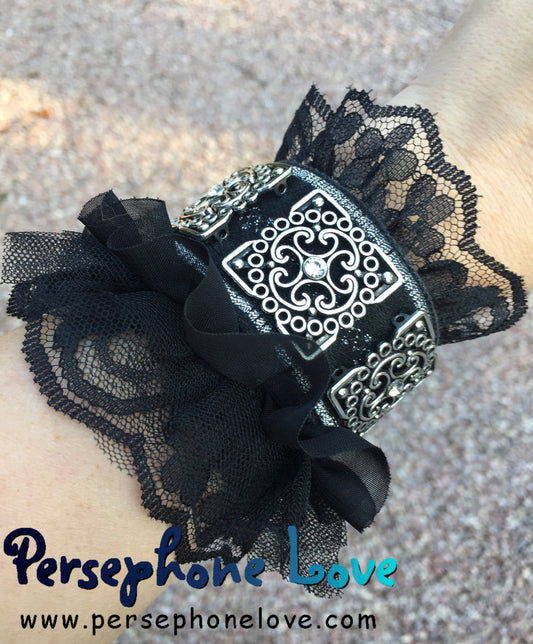 Black silver embroidered upcycled Gothic denim rhinestone bracelet lace-1167