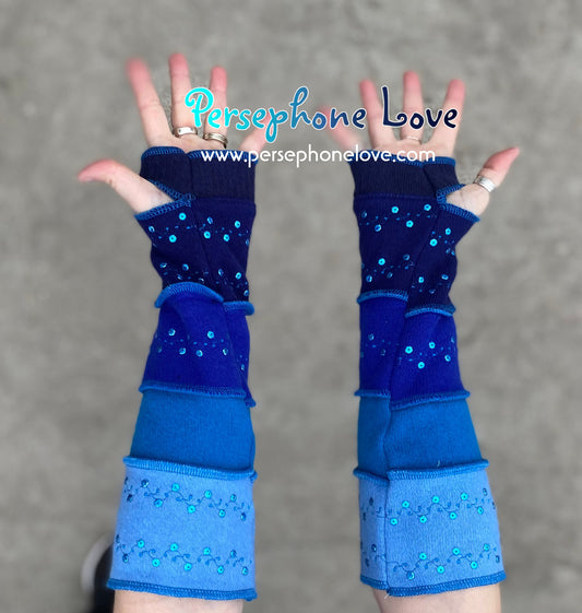 Katwise inspired needle-felted 100% CASHMERE galaxy blue upcycled sweater arm warmers SEQUINS-1361