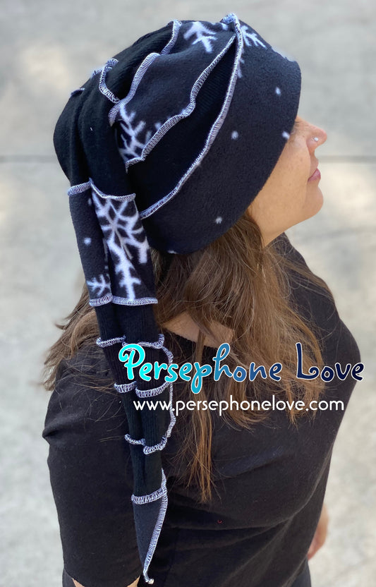 Katwise inspired black white snowflake 100% cashmere/fleece patchwork elf jester hat-1475