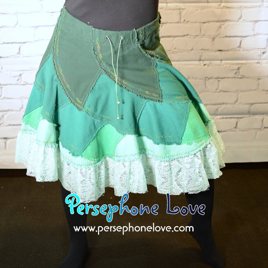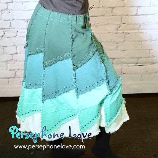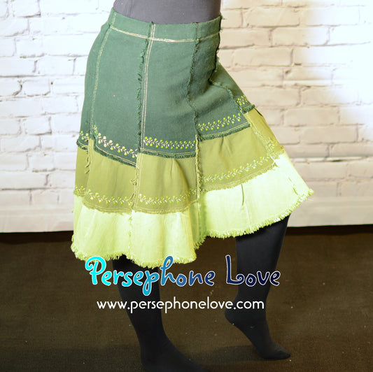 Green ombre patchwork denim upcycled twirly spiral festival skirt embroidery sequins-2002