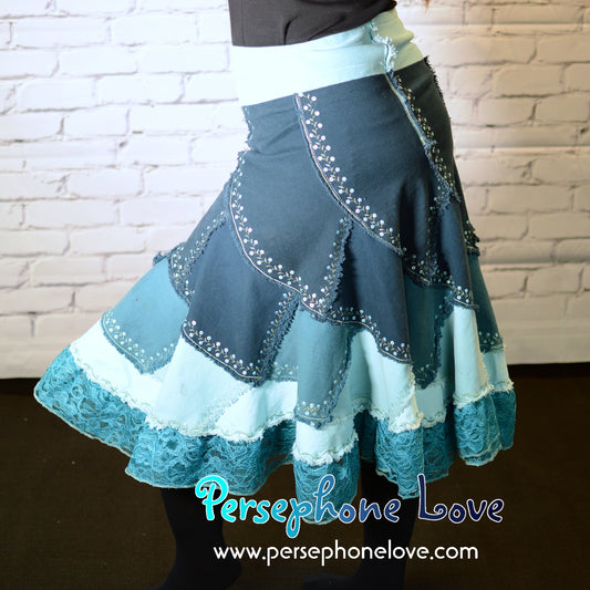 Turquoise ombre patchwork denim upcycled twirly spiral festival skirt embroidery sequins-2004